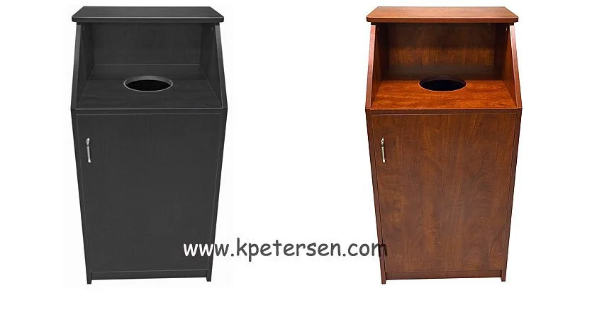 QUICK SHIP Top Drop Trash Containers are available in Two Colors: Black and Cherry Woodgrain Laminate.